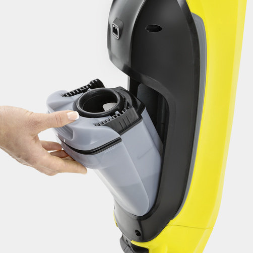 Hard floor cleaning without dragging around a bucket and no scrubbing? No problem for the Kärcher FC 5: It removes dust, small crumbs and pet hair and even wipes the floor at the same time – right up to the edge. The rotating rollers are permanently wetted with fresh water, while the collected dirt is transported to the waste water tank. This leaves hard floors of all kinds (tiles, parquet, laminate, PVC and vinyl) 20 per cent cleaner than a conventional mop* and they can be walked on again after approximately two minutes. Another practical feature: The rollers are machine-washable at 60 °C. Kärcher offers a wide range of detergents and different rollers for special floors (e.g. sealed wood, oiled/waxed wood, stone, etc.). After use, the FC 5 can be thoroughly cleaned with the self-cleaning function.